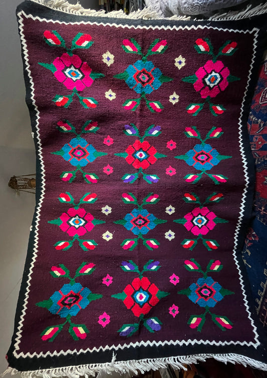 Handwoven Transylvanian Folk Rug (1990s) – Organic Wool Floral Kilim, Romanian Heritage Textile, 220 × 140 cm