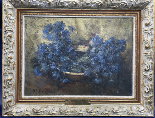 Blue Cornflowers, N. Alexandrescu (1946) – Oil on Wood, Original Exhibition Stamp