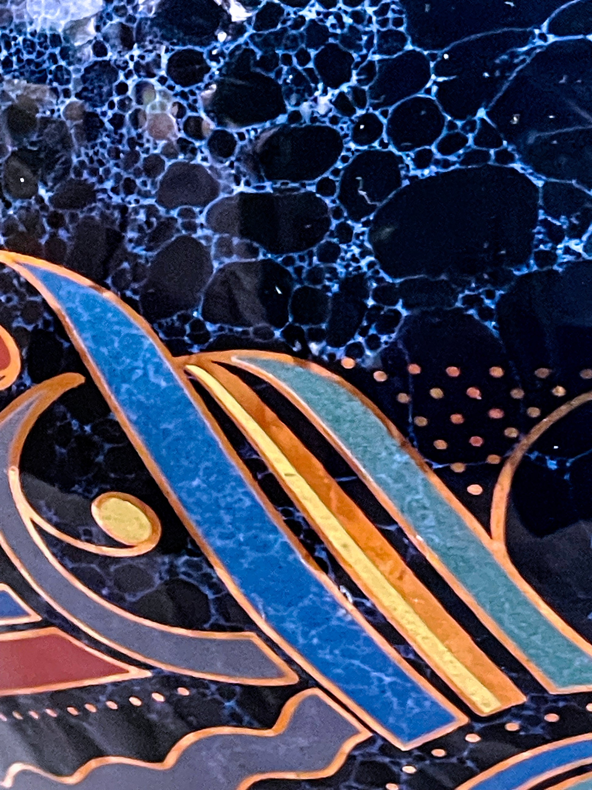 A bold and striking postmodern ceramic vase, standing 30 cm high and 18 cm at its widest, finished in a high-gloss midnight glaze with vivid geometric and abstract line motifs. Swirling ribbons, stylized plant forms, and dot clusters in saturated teal, crimson, and gold dance across the surface, evoking the playful sophistication of 1980s studio ceramics and Memphis Group aesthetics.