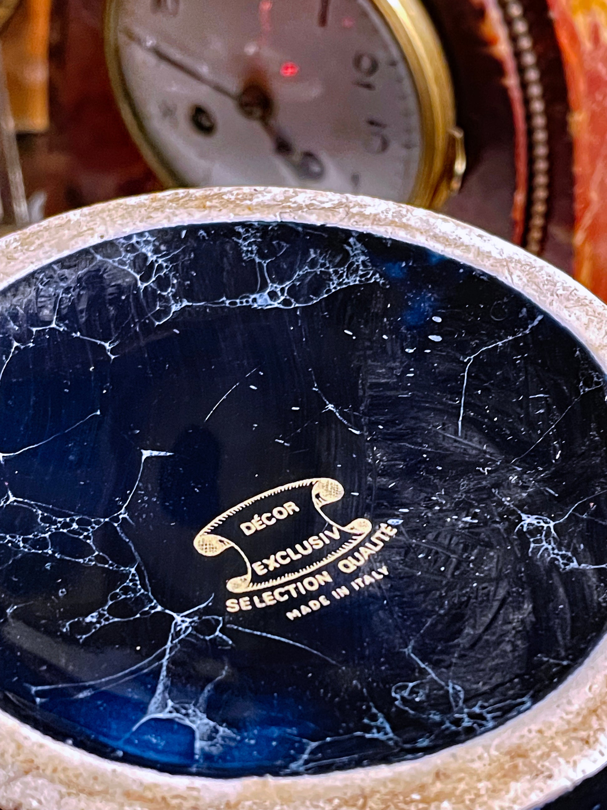 The flared mouth is accentuated with a gilded rim, adding a touch of luxe contrast to the vase’s otherwise moody palette. Its reflective surface beautifully catches the light and surroundings, making it a dynamic object whether placed in a minimalist setting or among other maximalist curios.