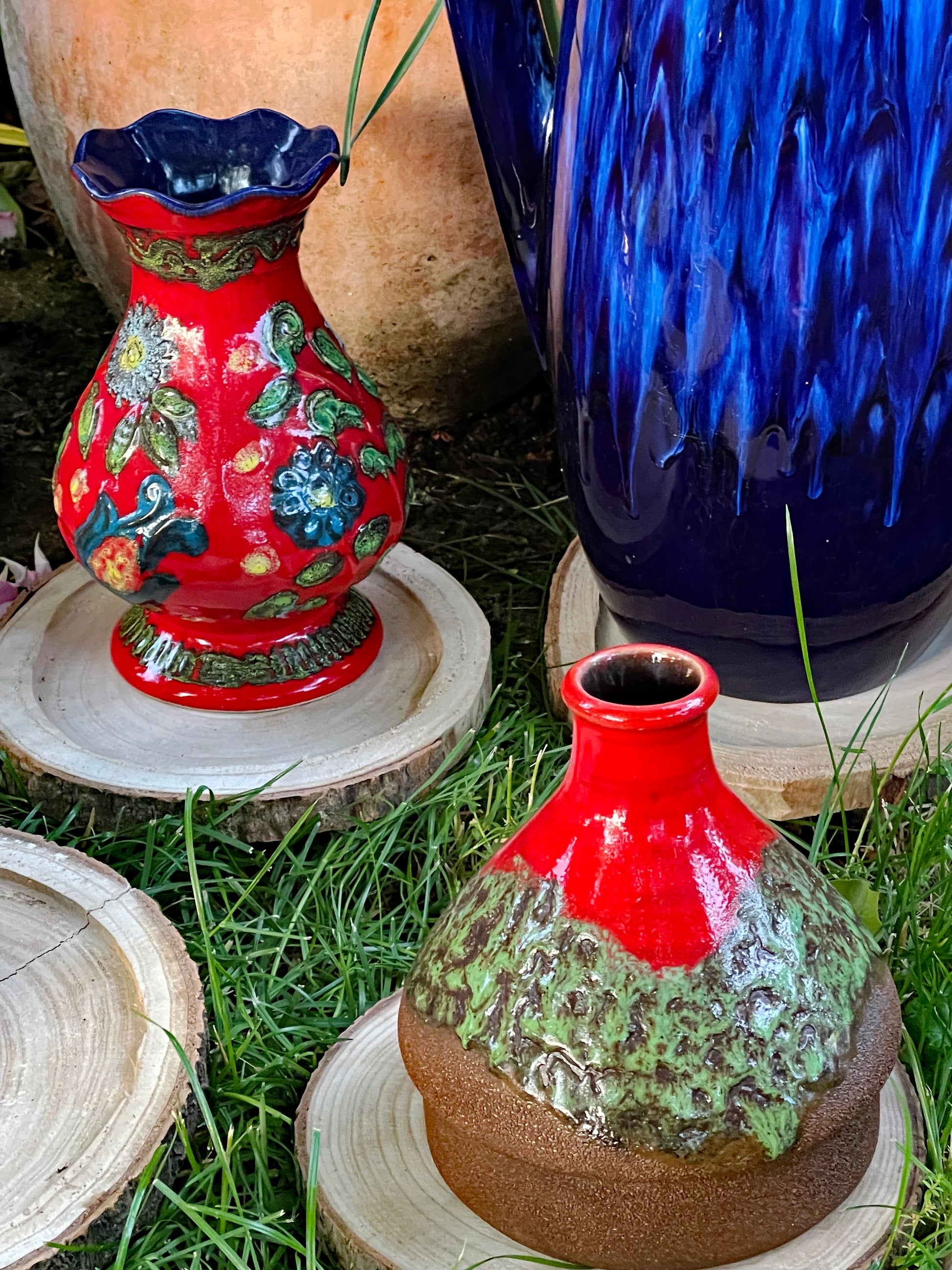 3) Red & Green Bulb Vase with Textured Glaze