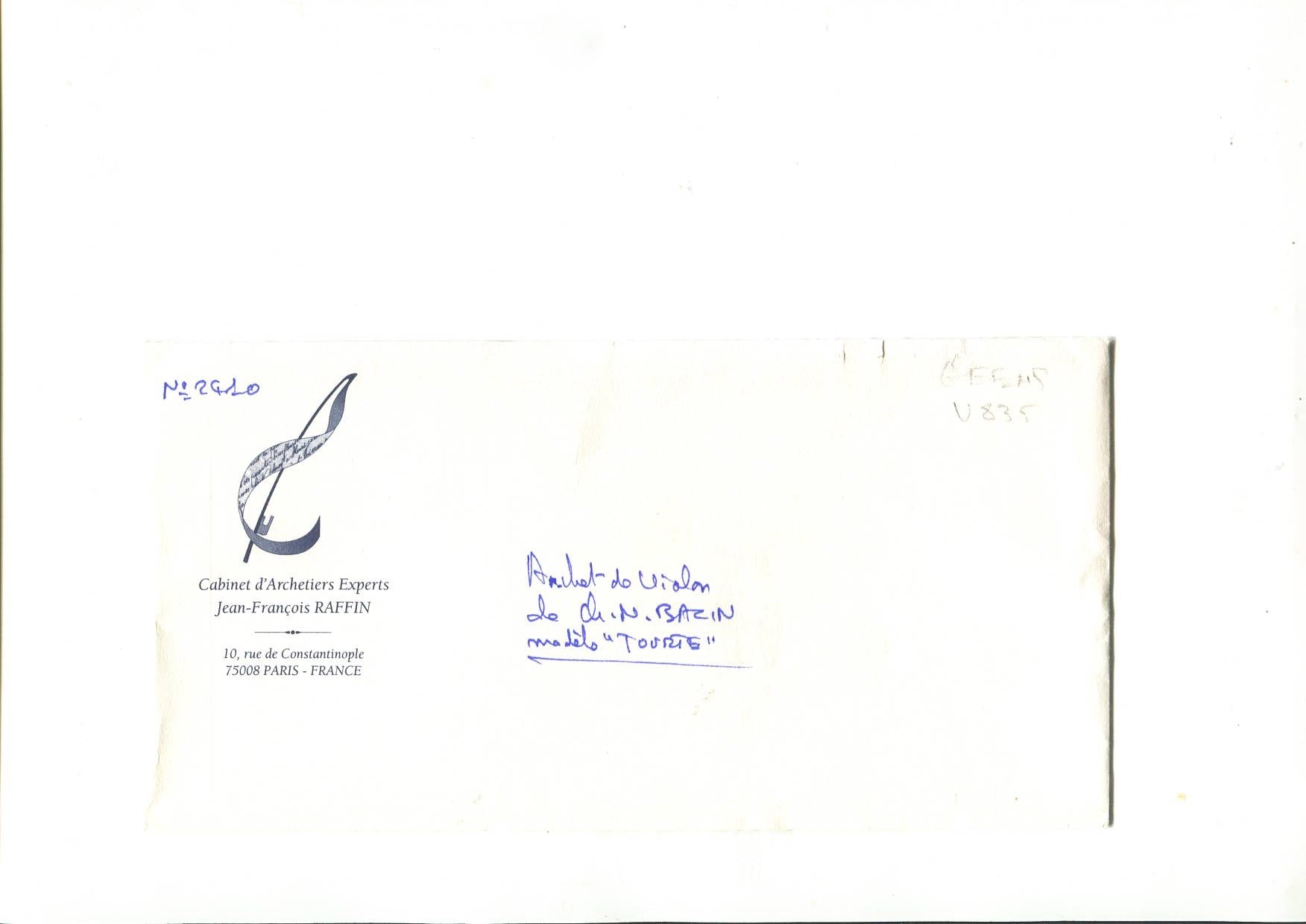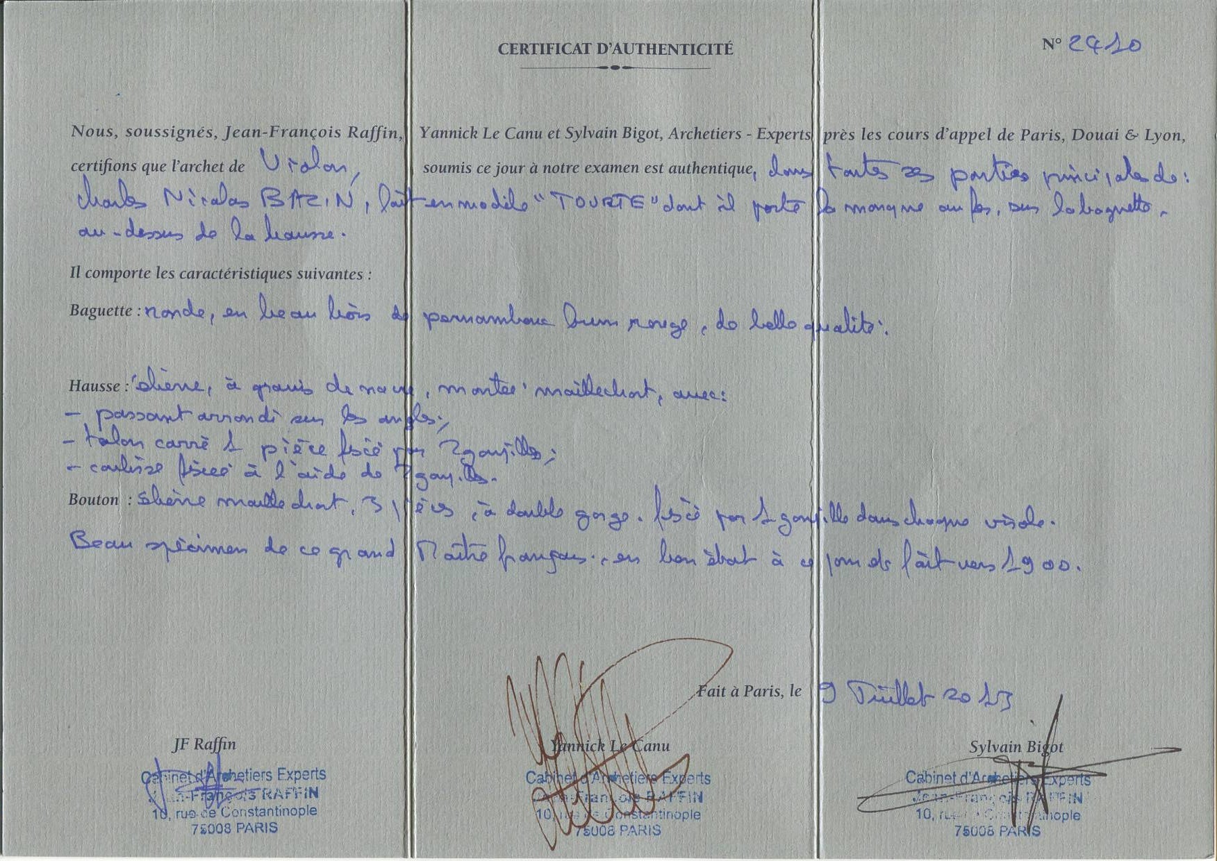 Accompanied by an original Raffin certificate of authenticity (No. 26410), confirming the bow as the work of C.N. Bazin, “modèle Tourte,” circa 1900 — signed by Raffin, Le Canu, and Bigot at the Cabinet d’Archetiers Experts, Paris.