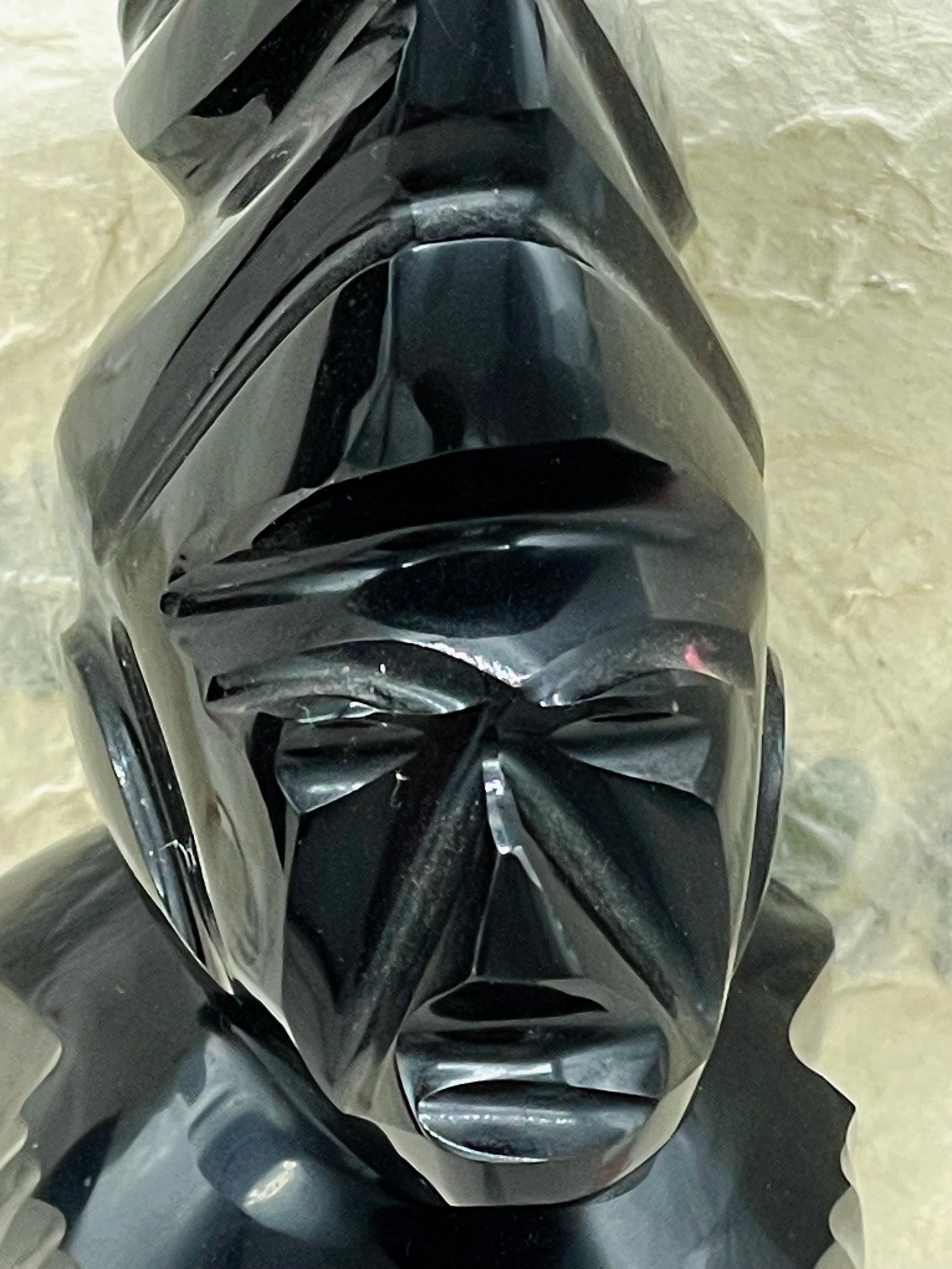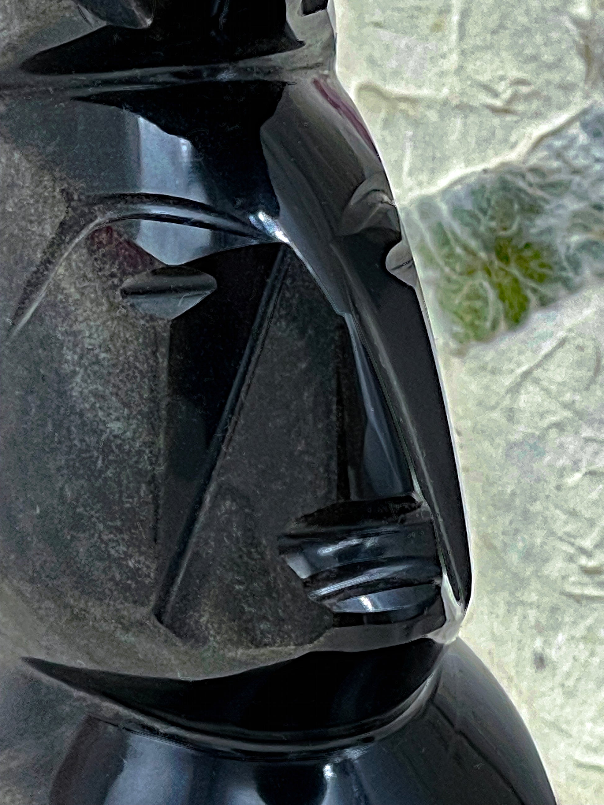 A striking pair of hand-carved Shona sculptures, likely from Zimbabwe, crafted from rich, high-polish serpentine stone—a material prized for its deep black luster and exceptional carving properties. These stylized figures reflect the Shona people's enduring sculptural traditions, combining ancestral reverence with modernist abstraction.