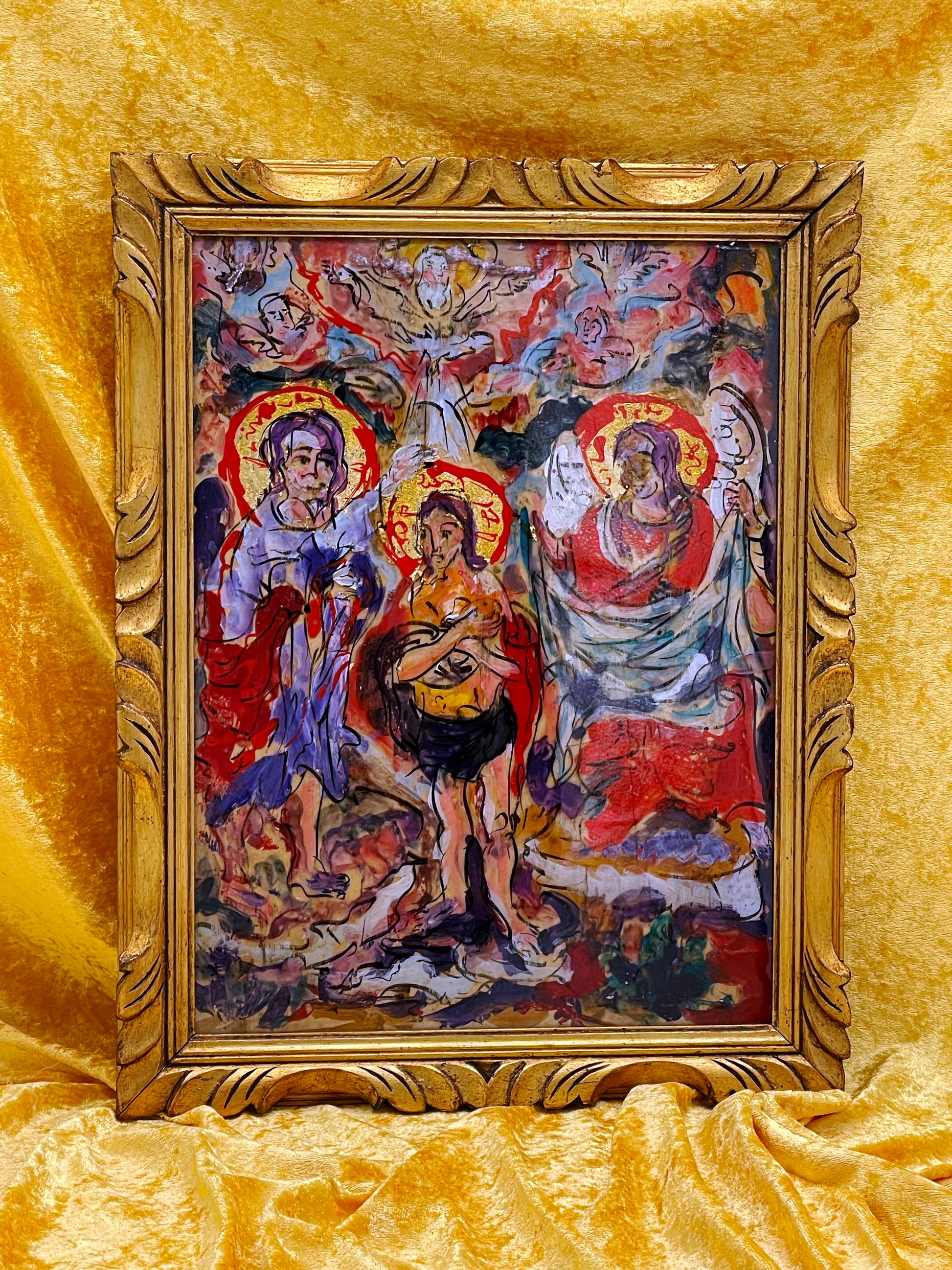 Original On-Glass Baptism of Christ – Expressive Religious Painting in Ornate Gilded Frame