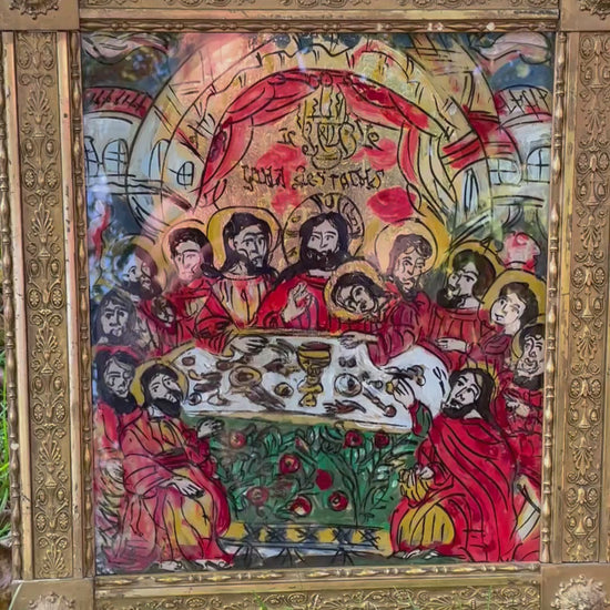 The Last Supper – Hand-Painted Reverse Glass Icon with 24k Gold Leaf in Ornate Gilded Frame