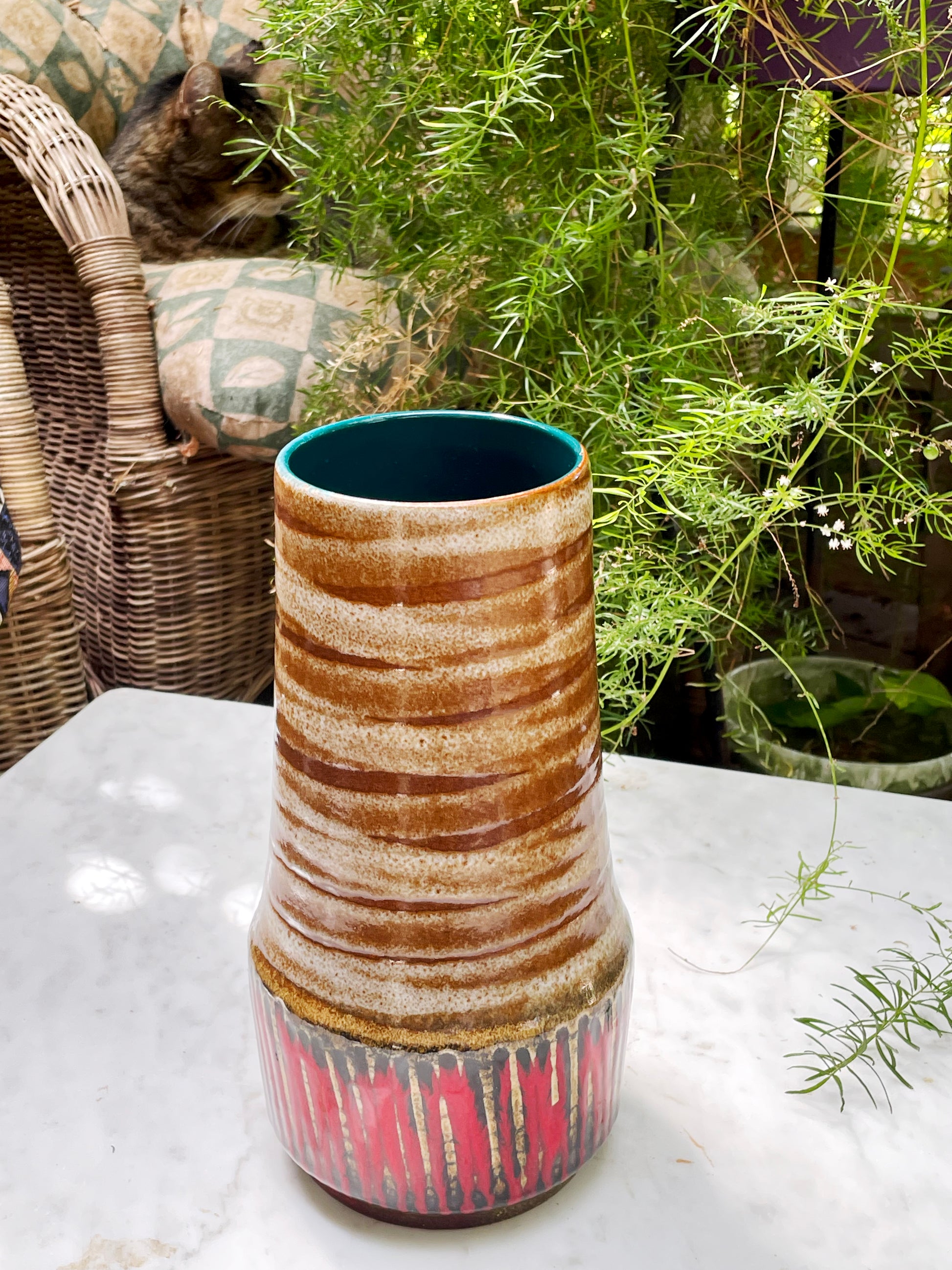 A striking vintage West German ceramic vase, showcasing the bold and experimental glazing techniques that made mid-century West German pottery world-renowned. The piece features a warm, earthy banded glaze in sandy browns and creams across the upper body, contrasted dramatically with a vivid red drip glaze at the base, accentuated by black vertical strokes and golden highlights.