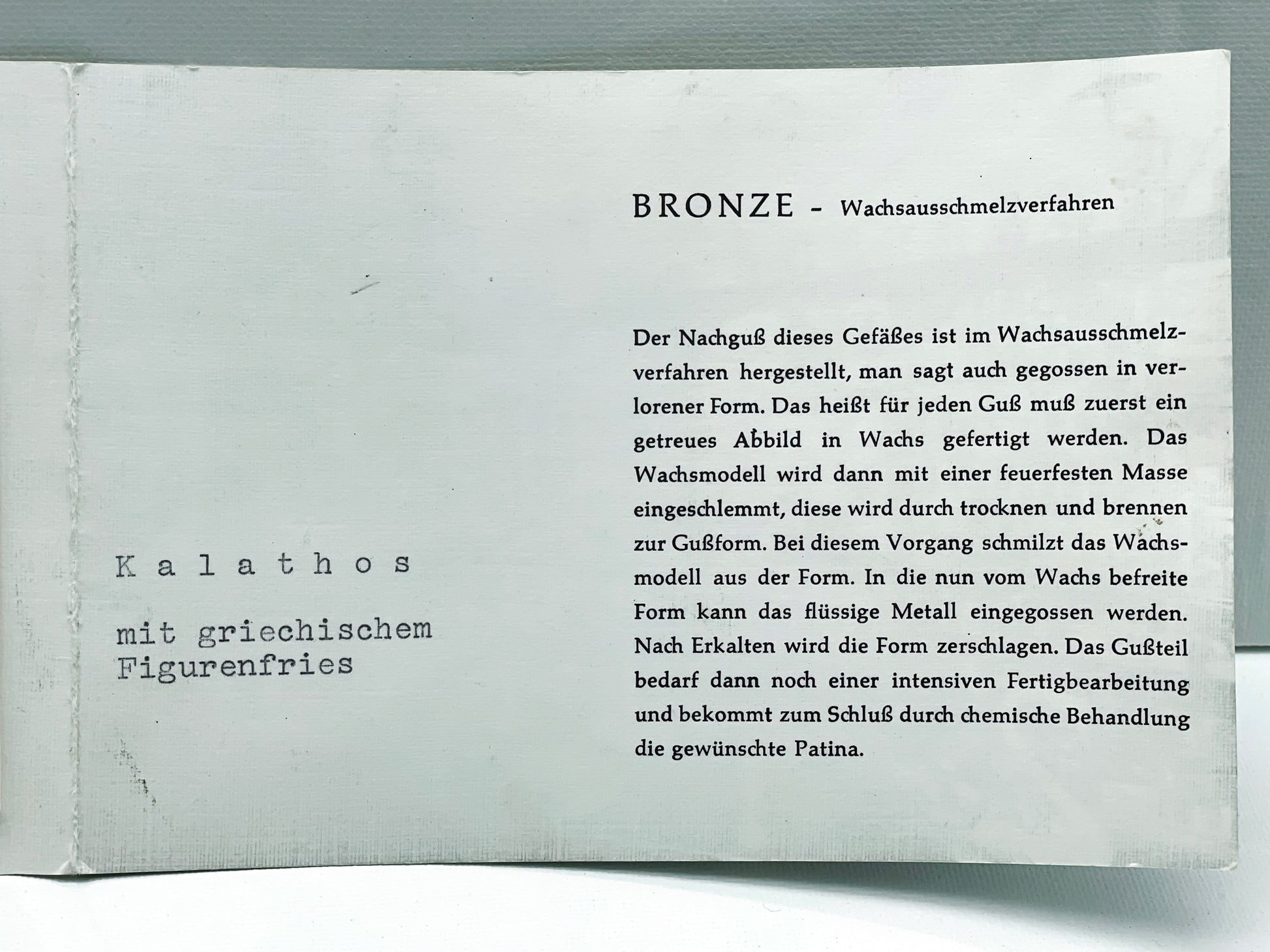 A richly detailed and substantial bronze kalathos, weighing approximately 3 kilograms, inspired by the classical forms of ancient Greece and Rome. This ceremonial vessel, traditionally used for offerings or as a symbol of abundance, features a tapered, flared form with intricately cast figural reliefs, floral medallions, and grapevine friezes wrapped in rhythmic geometric borders.